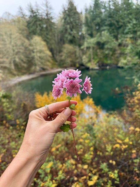 November was waking up to tall pines and quiet and feeling cradled in the deep gray embrace of Orcas Island. It was kimchi risotto and the moss-carpeted path to the great blue heron and sucking the Salish sea from my fingers. It was warm hugs from strangers and conversations from the places we’ve buried and learning how to hold the life I want. It was my son’s bed head in the blue-fog dawn, and the unexpected peace of standing inside the void instead of fleeing it. It was grieving every leaf that fell and trying to gather them all from my sky before they hit the ground. It was my uncle visiting from England, the two of us talking for hours over a cup of tea gone cold, and the way gratitude for him tangled with the grief of everything I once had and lost with my father. It was the black sea, black sky, black night after a healing of sound and arriving with no other intention but to be (or find) myself. It was drinking lattes in a penny lane coat and 16-hour travel days to an island of water and magic and knowing I would do it all over again in a heartbeat. It was stripping everything away from my life up to the last fifteen minutes on Earth and finding that for once I am not the one doing the holding—I am the one being held. Is that what it takes for me to allow myself to be loved? It was a postcard blooming with poppies that led me to my future and teaching a room full of writers how to breathe their way into their story to find out where the truth lives. It was waiting for the tea to steep and curling up with my dogs in their bed and matching my breath with theirs. It was sunset persimmons on my tongue in the morning and crying in the rain and waiting for the sea to give me an answer. It was brushing shimmer eyeshadow over my eyes and stacking rings on my fingers just like my mother used to do, and wondering how much of the cycle has been broken. It was rosemary old-fashioneds and a dear friend saying yes to love and sitting on bales of hay around a campfire. It was beginning and ending every day swallowed by the salt and sky, and knowing there is no other way I want to live my life. It was writing at the edge of the water and filling my pockets with rust-colored stones and pressing wildflowers into rain-soaked pages. It was almost forgetting my father’s birthday and thinking, what does it matter anyway, when did we become the sort of relationship that gets checked off a list? It was buttery pie crust that flaked and melted in my mouth and homemade birdseed ornaments and stringing rainbow lights around the Christmas tree. It was watery hot chocolate and parades of decorated tractors down Main Street and loving and hating the simplicity of it all. It was pockets full of poems and leaning into my gifts, my way of turning darkness into light, my way of bringing safety into rooms where there was none. It was writing our fears into power on sticky notes and dance parties and sweaty group hugs that I will remember forever. It was hot soaking tubs overlooking the island and ferry rides in the darkness and communing with the sea birds. It was a friendship blooming over a car ride, talking about where we go when we dream, what waits for us at the river, and how sometimes giving up the fight for the people you love is the only way to save yourself. It was stepping out again and again into a life I don’t yet have, hoping it will catch me. Will it catch me?